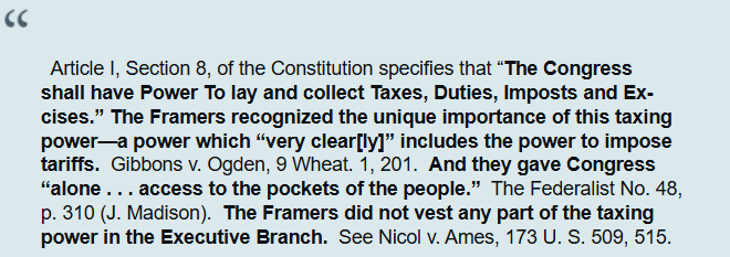 То есть ВС определил, что Конституция США напрямую и четко уполномочивает именно Конгресс США вводить налоги,пошлины, сборы и акцизы.И отцы основатели четко наделили именно Конгресс правами, включая право на установление тарифов. И отцы основатели уполномочили именно и только один единственный Конгресс США иметь право влезать в кошельки людей (народа). Также отцы основатели не давали никаких прав исполнительной власти в части налоговых полномочий.