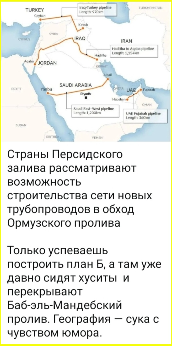 Газета пишет, что государственная нефтяная компания Saudi Aramco перенаправляет по этому трубопроводу нефть в обход Ормузского пролива.