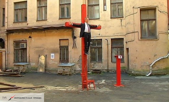 По данным европейских СМИ, во дворе дома бывшего здания КГБ на улице Стабу в Риге появилась инсталляция в виде человека, якобы символизирующего российского лидера Владимира Путина, распятого на кресте. Всем желающим предлагается вбить гвоздь в куклу. «Распятый президент» – часть крупной выставки, которая развернулась в эти дни у рижского КГБ.