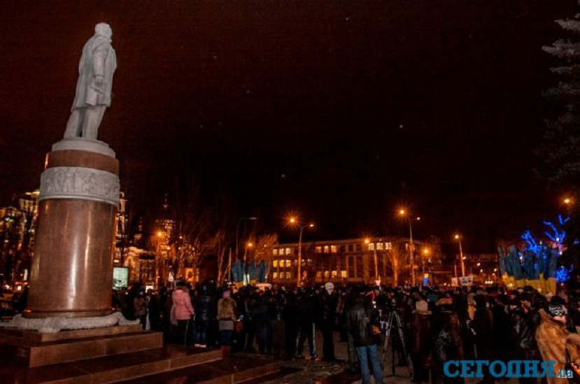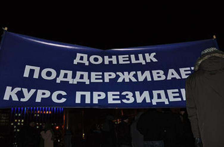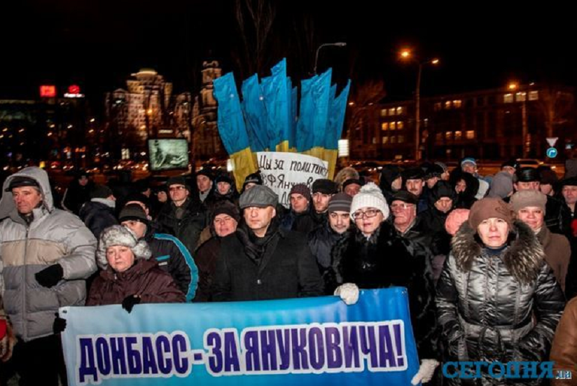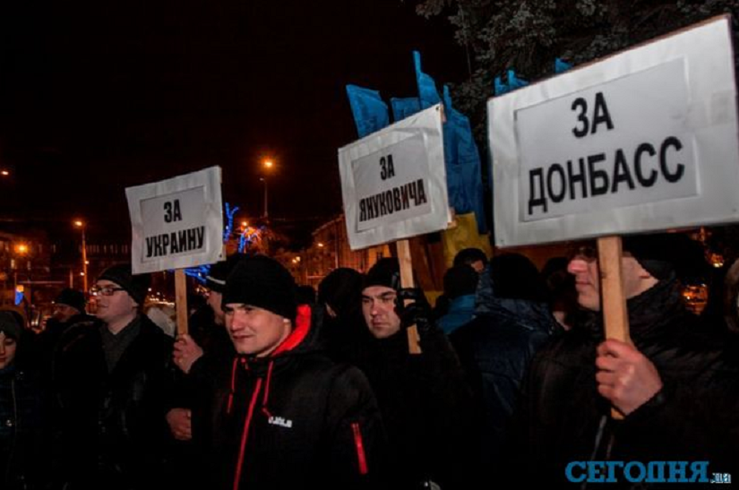 Как рассказали «Сегодня» участники Евромитинга, к монументу пришли десятки людей с символикой Партии регионов и плакатами «Донецк поддерживает курс президента», «Народ это не только майдан! Народ у станков и в забое!»