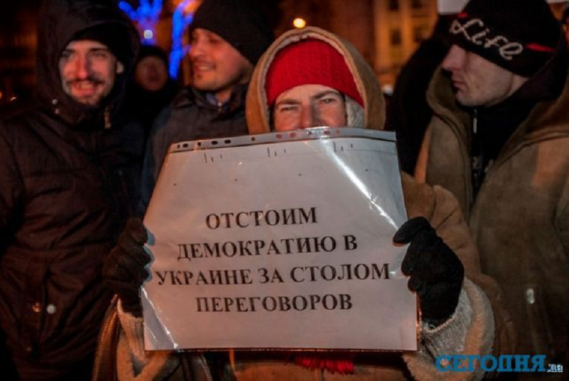 Противники Евромайдана выступление своих оппонентов заглушали музыкой – из громкоговорителей неслась песня «Священная война», больше известная как «Вставай, страна огромная!»