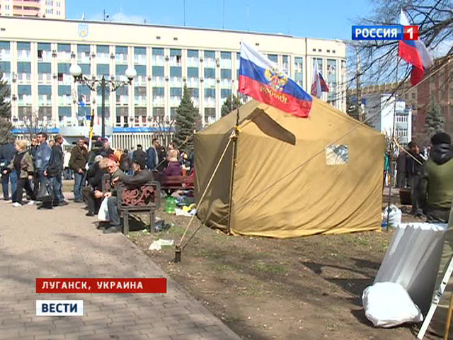 С самого здания уже сорвали все атрибуты украинской власти, а над входом повесили орден красной звезды. Почти в круглосуточном режиме идут митинги, на которых люди требуют провести референдум о статусе Луганской области.
