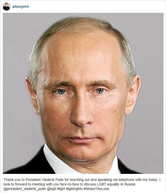 - Благодарю президента Владимира Путина за отклик и сегодняшний разговор по телефону, - написал Элтон Джон. - Я с нетерпением ожидаю личной встречи с вами для того, чтобы обсудить вопросы равноправия представителей ЛГБТ-сообщества в России, - написал британский музыкант на своей официальной странице в Инстаграме.