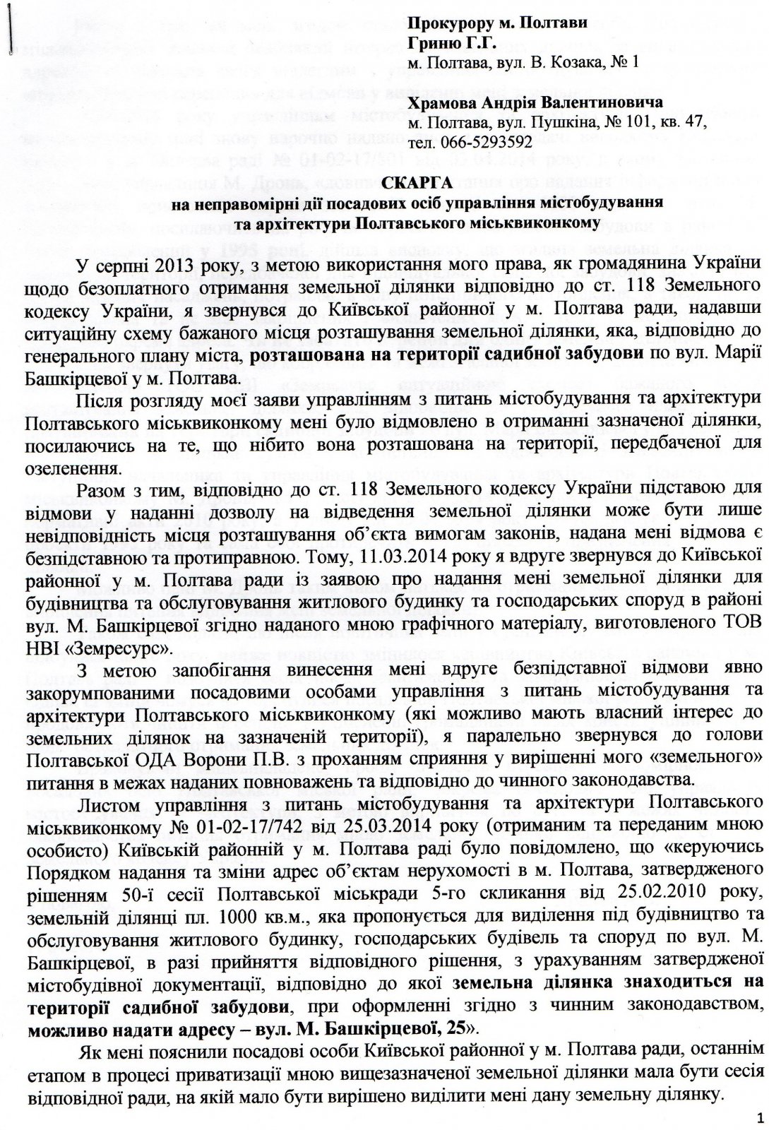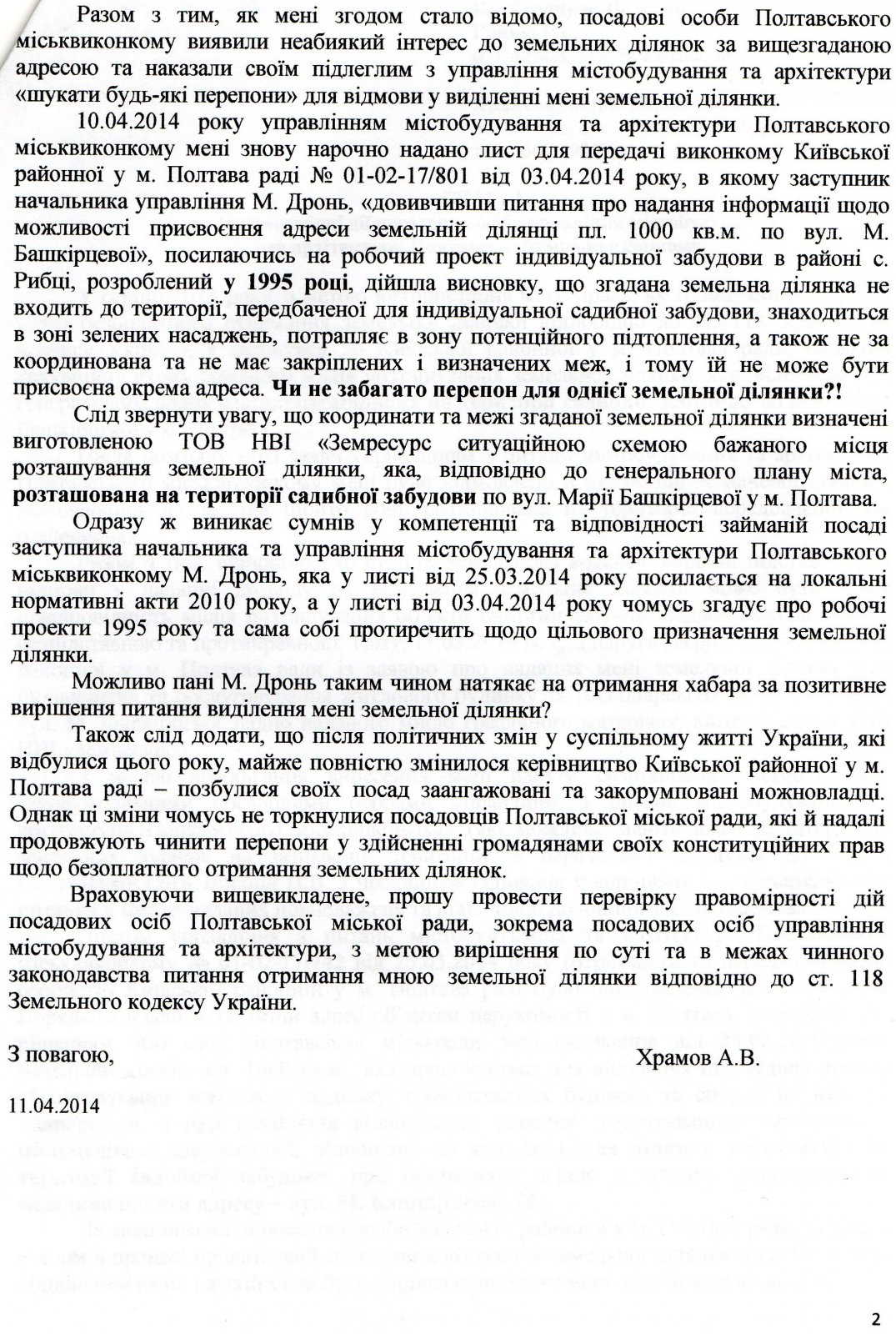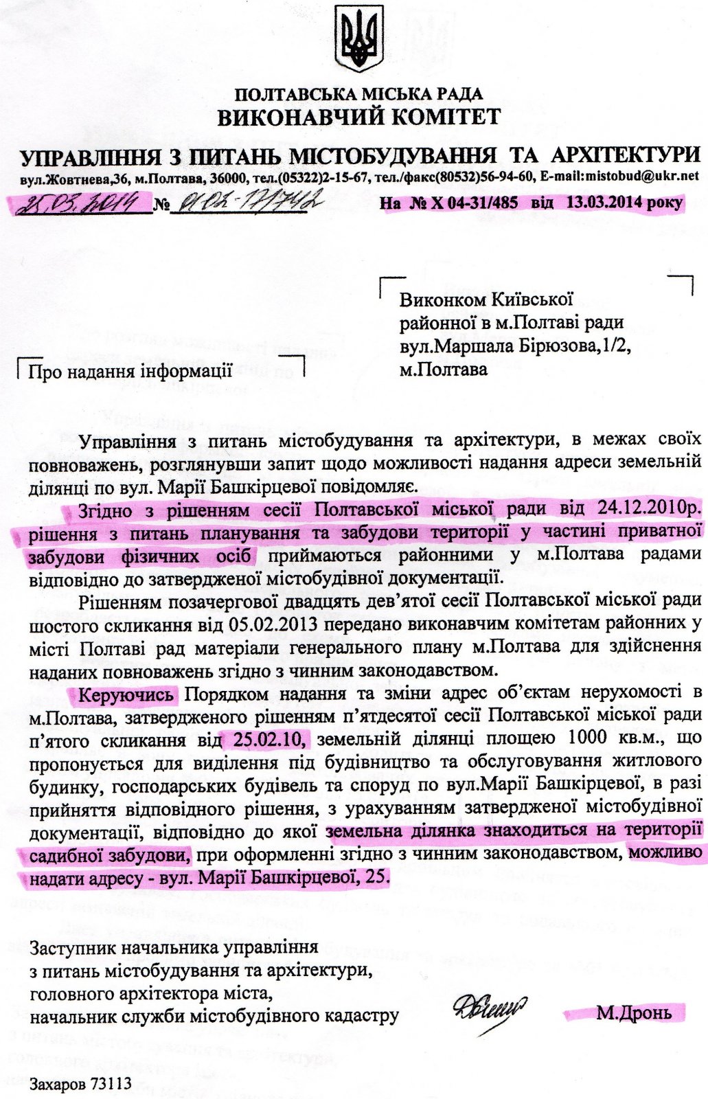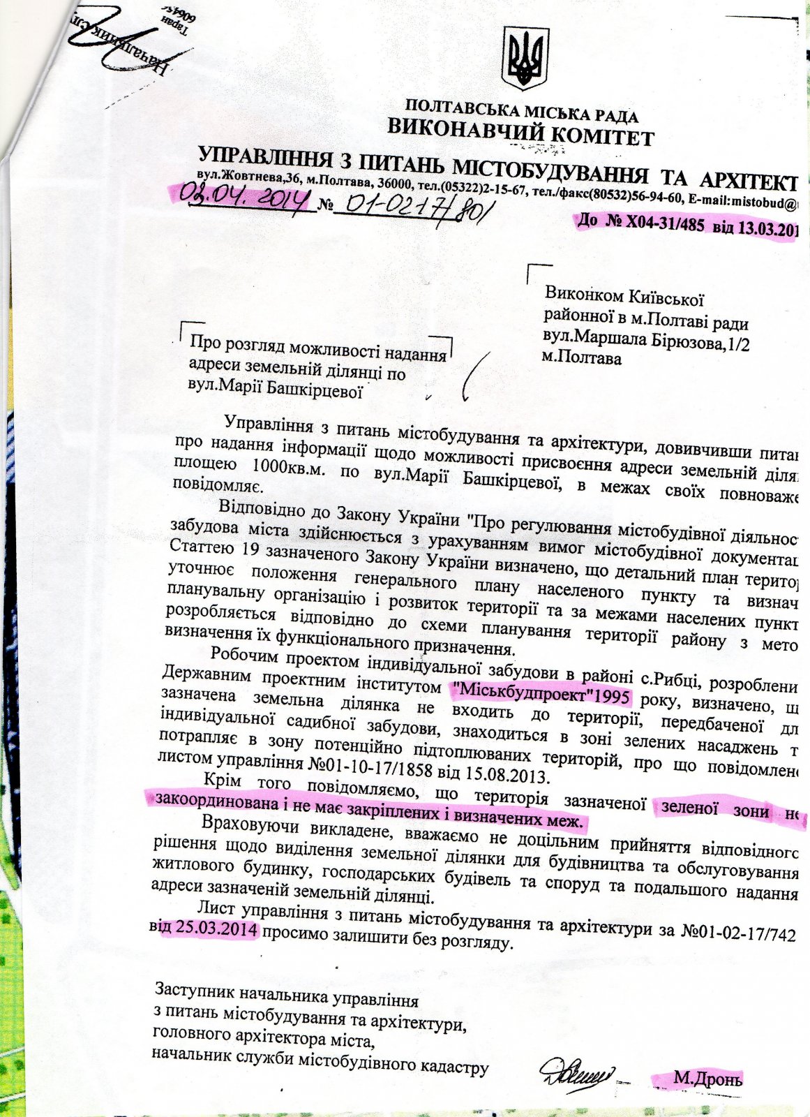 10 апреля 2014 года я получил ответ с Управления градостроительства и архитектуры, в котором заместитель начальника Управления Марина Дронь, ссылаясь на рабочий проект (хотя существует Генплан города утвержденный 2012, на котором четко видно что участок находится в садибній забудові) индивидуальной застройки в районе с.Рыбцы, разработанный в далёком 1995 году, делает вывод, что упомянутый земельный участок не входит в границы территории, предназначенной для индивидуальной застройки.