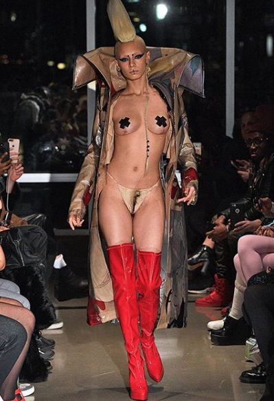 На подиум вышли модели в плащах и коротких куртках, надетых на голое тело. Дизайнер решил обойтись минимальным количеством вещей, поэтому образ завершали сексуальные высокие ботфорты и босоножки на каблуке. На этот раз интимные зоны манекенщиц прикрывали не трусики, а меховые парики.
