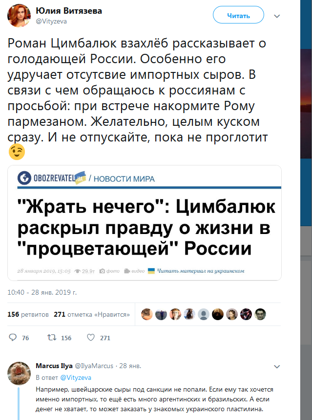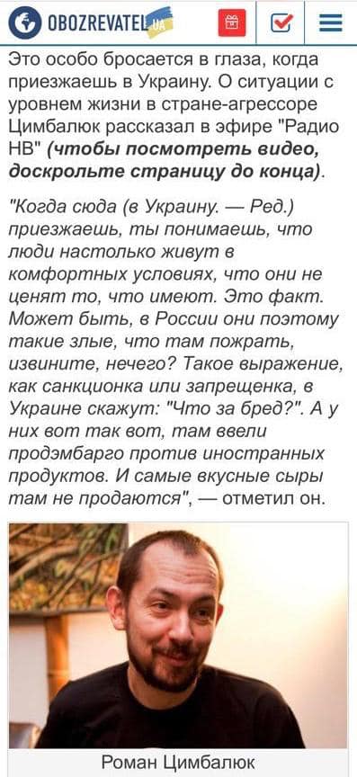«А вы в курсе, что, согласно данным служащих украинского агентства УНИАН, в России голод? Не в курсе? Надо слушать Роман Цимбалюк, который регулярно снабжает мир «фактами» о России»,