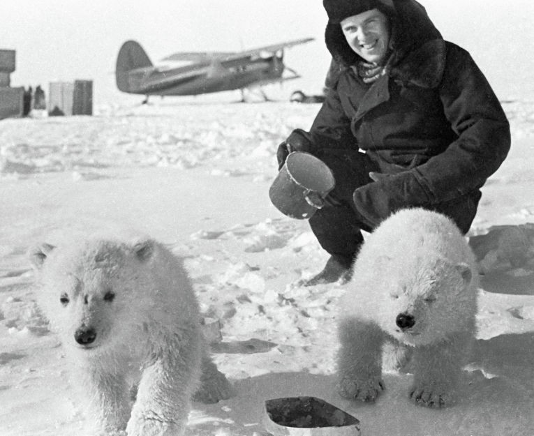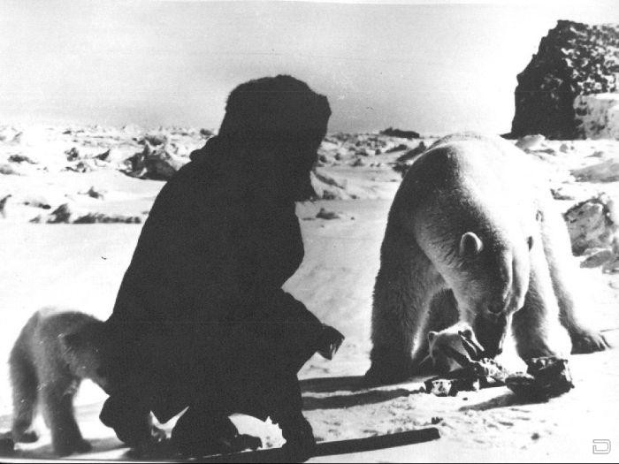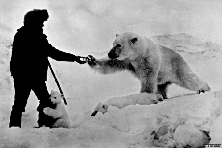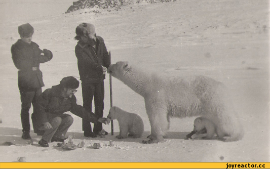 СССР, Крайний Север, 80-е годы. Полярники подкармливают голодную медведицу сгущенкой. Она лапой выдавливала молоко, съедала, а потом уже кормила медвежат.