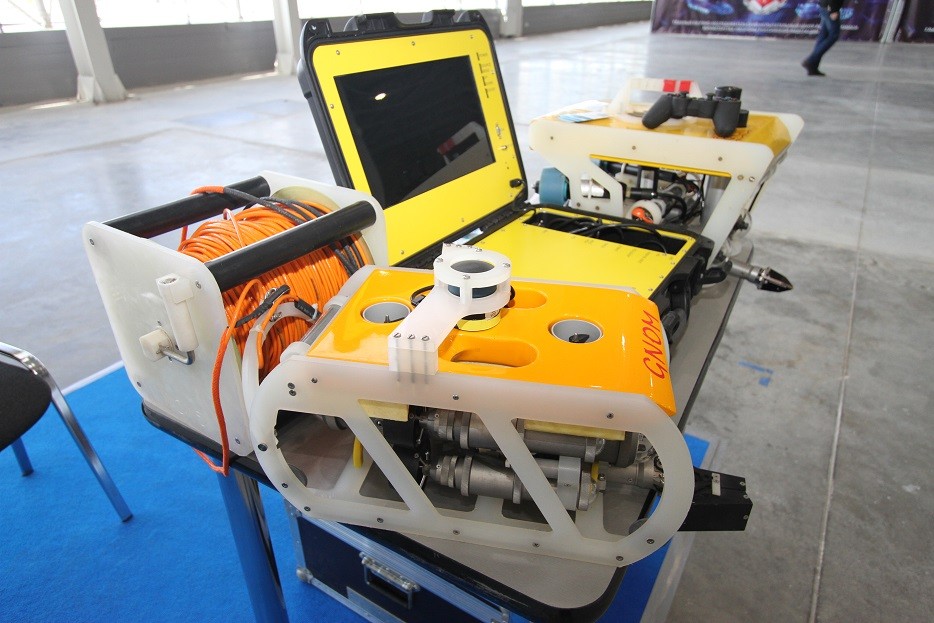 Серийно производимые малогабаритные телеуправляемые подводные аппараты «Супер ГНОМ» (на переднем плане) и «Супер ГНОМ Про» на стенде компании «Подводная робототехника» (Москва). Кубинка, 23.03.2017 (с) Денис Федутинов