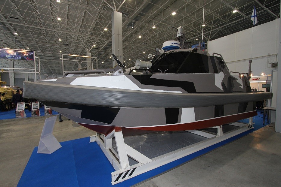 Санкт-петербургская компания АО «НПП «Авиационная и морская электроника» (АМЭ) представила роботизированный многофукциональный безэкипажный катер, оснащенный системой оптико-электронного мониторинга надводной обстановки. Катер разработан при финансировании Министерства промышленности и торговли России, опытный образец проходил испытания в районе Кронштадта в 2016 году. Масса целевой нагрузки катера составляет до 500 кг (опытный образец был оснащен ГАС), катер оснащён двумя двигателями российского производства по 220 л.с. каждый. Радиус действия катера до 30 км. Кубинка, 23.03.2017 (с) Денис Федутинов