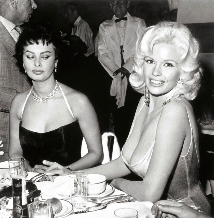 Софи Лорен и Джейн Мэнсфилд на вечеринке, устроенной компанией «Двадцатый век Фокс», в честь Софи Лорен в апреле 1957 года. (Фото: Vanity Fair)