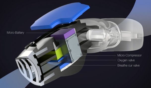 - Микрокомпрессор респиратора питается от микробатареи, которая представляет собой разработку следующего поколения, имеет размер в 30 меньше существующих на сегодняшний день батарей — и при этом заряжается в 1000 раз быстрее их.