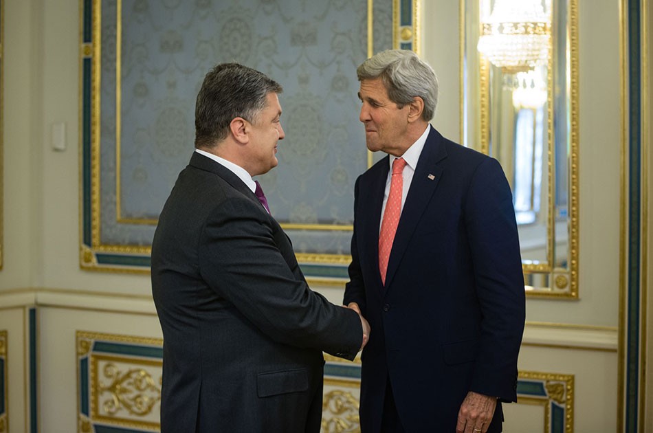 Нет сомнений, что во время вчерашней встречи в Киеве госсекретарь США поздравил украинского президента с дебютом в The Wall StreetJournal. Фото с официального сайта Петра Порошенко.