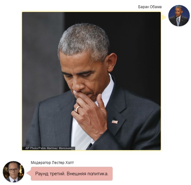 Демократ Хиллари Клинтон и республиканец Дональд Трамп впервые схлестнулись в очных дебатах. Противостояние обещает быть историческим: с одной стороны на пост президента впервые претендует женщина, с другой — никогда прежде не занимавший выборных должностей миллиардер. Бывший госсекретарь Хиллари Клинтон обладает большим политическим опытом, тогда как Трамп для этой сферы — новичок. Самые яркие высказывания двух кандидатов и представили, как бы выглядела их словесная битва в окне чата.