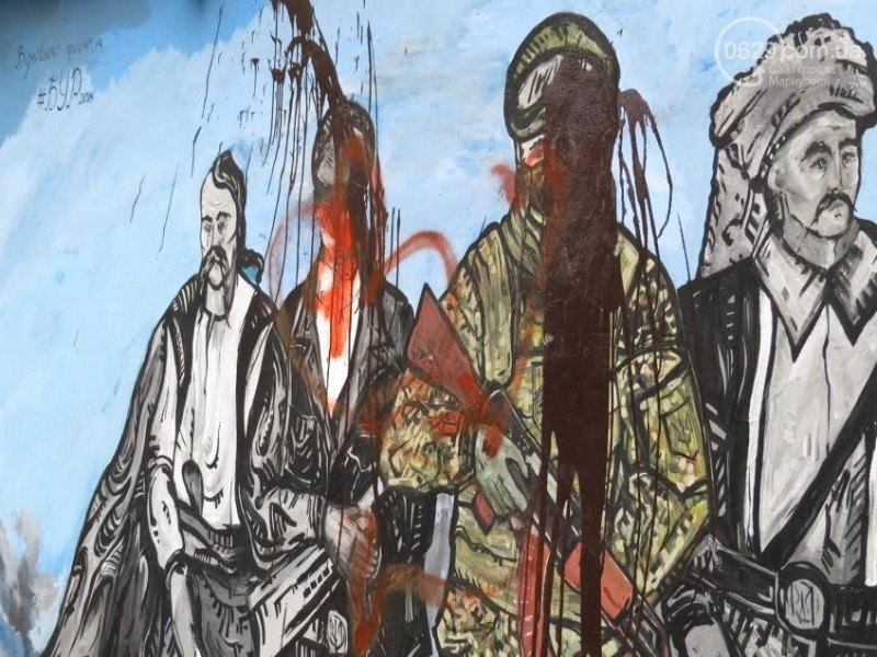 "На это раз поверх краски, вылитой на образы воинов УПА и "Азова" после восстановления настенной картины украинскими активистами проекта "БУР", панно было разрисовано красной краской", - отметил мариуполец.