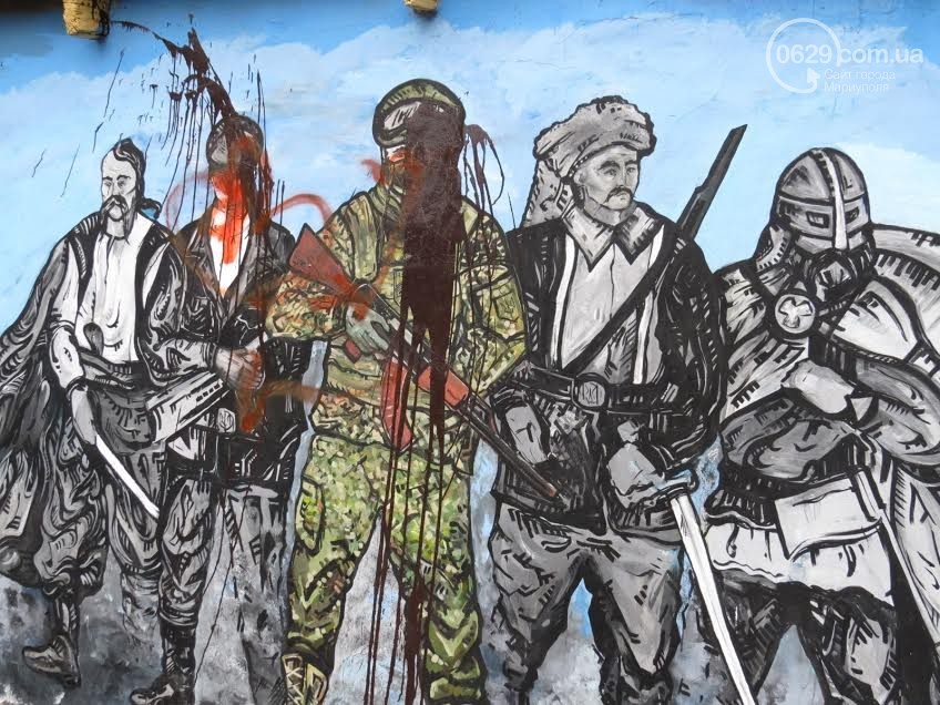 В благодарность за "освобождение": в Мариуполе неизвестные залили кровавой краской мурал, намалеванный "Азовом"