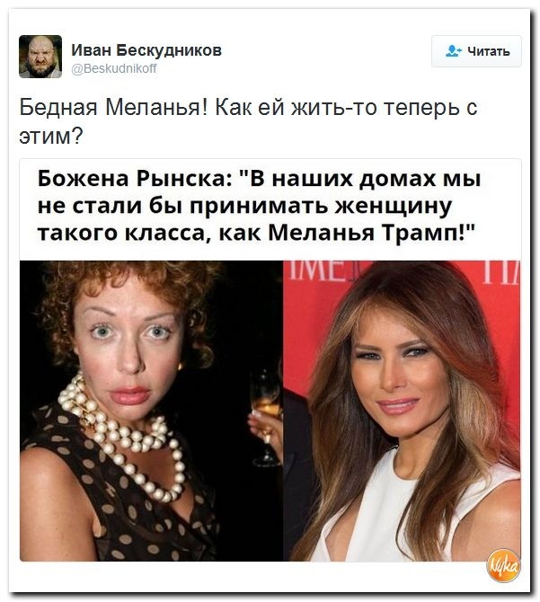 "Мне кажется, она выглядит не очень уместно, потому что это типичная "trophy wife", трофейная жена, которая очень дорога в использовании, не женщина-партнер. Это свидетельствует о неком инфантилизме Трампа", - сказала Рынска и добавила, что "мода" на таких женщин прошла и сейчас принято жениться на "интересных" дамах. Напомним, Рынска несколько лет назад вышла замуж за бывшего гендиректора НТВ Игоря Малашенко.