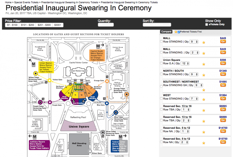 Разброс цен — от 449 долларов до почти 16 тысяч. Самый дешевый билет — это стоячее место на задворках Капитолийского холма, откуда вряд ли будет видно саму церемонию инаугурации и момент присяги Дональда Трампа на Библии. Чем ближе места к трибуне, тем они дороже. Самые дорогие — за 15750 долларов — в 5 ряду от трибуны. Еще ближе места не продаются, пригласительные на них будут розданы почетным гостям церемонии.
