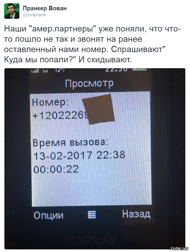 Как пишет пранкер, с американского номера, оставленного ими ранее для связи, сейчас поступают звонки. Некто интересуется, куда они попали, а затем отключается: