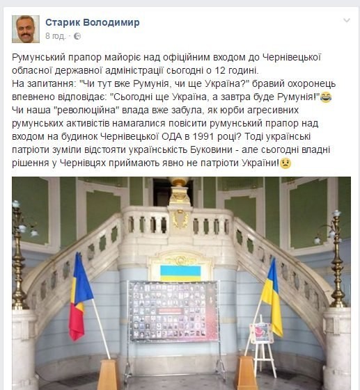 Во Львовской и в Закарпатской областях на админзданиях радом с висящими пока еще украинскими флагами висят флаги Польши и Венгрии, и вот к этому списку присоединились Черновцы. На входе в обладминистрацию там появился румынский флаг, а охранник, на вопрос Черновцы это еще украина или уже Румыния говорит –сегодня еще украина, а завтра будет Румыния. Намек, как говорится, понятен, просто Румыния оказалась аутсайдером среди приграничных к бывшей украине стран, претендующих на территории. Но я верю, Румыния своё наверстает.
