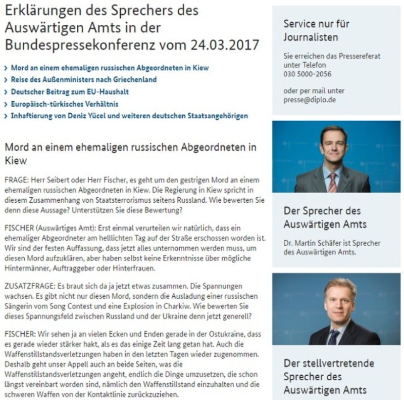 Одной из тем последней пресс-конференции в дипломатическом ведомстве Германии стало резонансное убийство бывшего депутата Госдумы в центре столицы Украины. В частности, присутствующих на мероприятии журналистов интересовал вопрос о том, как официальный Берлин относится к версии украинских властей, утверждающих, что в случае с убийством Вороненкова речь идет о «государственном терроризме».