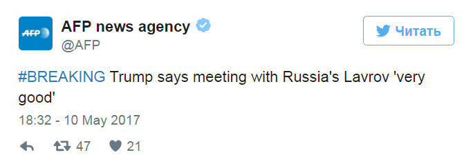 Президент США Дональд Трамп назвал очень хорошей встречу с главой российского МИД Сергеем Лавровым.
