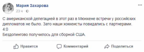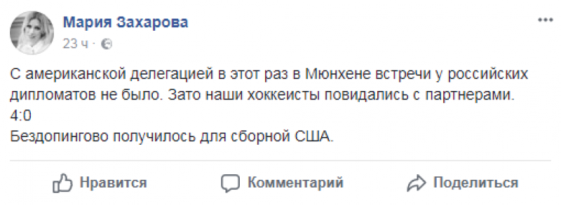 «С американской делегацией в этот раз в Мюнхене встречи у российских дипломатов не было. Зато наши хоккеисты повидались с партнерами. 4:0, – пишет Мария Захарова. – Бездопингово получилось для сборной США».