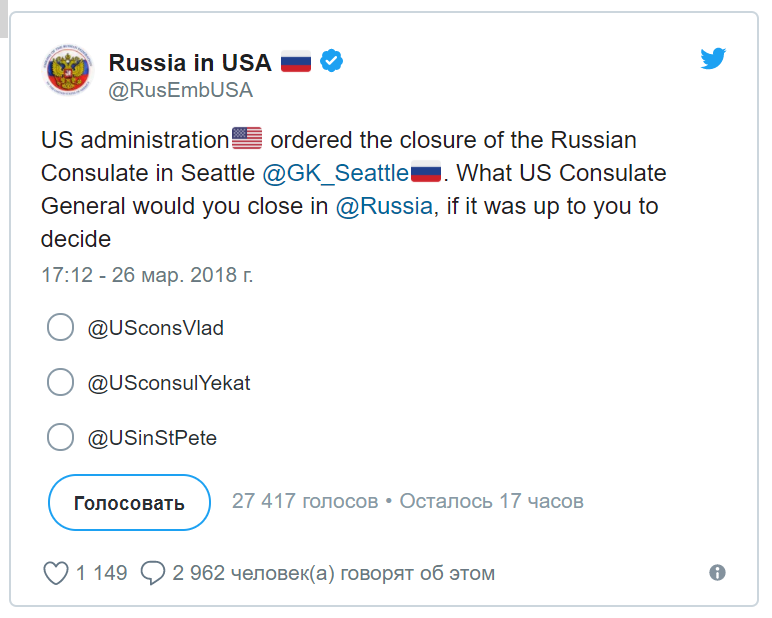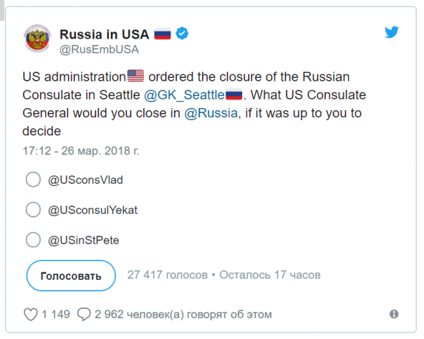 "Какое генконсульство США в России вы бы закрыли, если бы вы могли принять такое решение?" — говорится в Twitter дипмиссии.