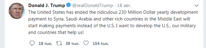 «США прекратило нелепые выплаты ежегодной компенсации 230 млн. долларов на развитие Сирию. Пусть Саудовская Аравия и другие богатые страны Ближнего Востока начнут платить, а не США. Я же хочу помогать нам развивать Соединенные Штаты, нашу оборону и государственность!»