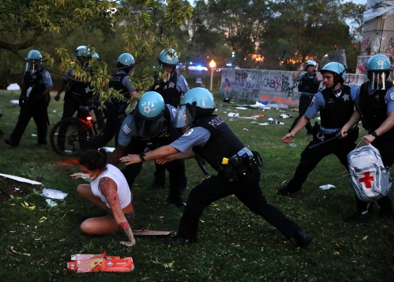 Протестующие и чикагская полиция столкнулись после того, как протестующие попытались свергнуть статую Христофора Колумба в Грант-парке после митинга, призывающего к расформированию Чикагского полицейского управления 17 июля 2020 года