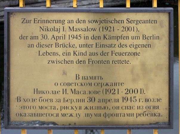 Этот подвиг запечатлен в монументе, который в 1949 году открыли в Трептов-парке. Центральная скульптура в исполнении Евгения Вучетича — советский солдат, который левой рукой прижимает к груди спасенную немецкую девочку, а в правой держит опущенный меч. Под ногой у него разбитая немецкая свастика. Этот солдат стал символом освободительной миссии Советского Союза и победы над врагом.