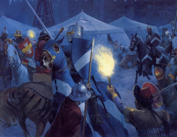 В 1280 году он покорил Алеппо, но в великой битве при Хомсе, состоявшейся 29 октября 1281 года, монголы были разбиты и отброшены, убедившись ещё раз в истинной мощи мамлюкской армии. После этой славной победы султан Калаун обратил внимание на земли христианского Заморья.