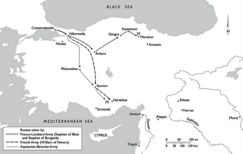 Третья армия крестоносцев, набранная из французов, фламандцев и бургундцев — всего около 8000 человек — во главе с графами Стефаном Бургундским и Стефаном Блуасским (дезертиром Первого похода, который новой экспедицией решил загладить своё малодушие) вышла в марте и добралась до столицы Византии в мае 1101 года.