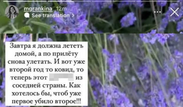 "Завтра я должна лететь домой(на Украину), а по прилете снова улетать. И вот уже второй год то ковид, то теперь этот *** из соседней страны. Как хотелось бы, чтоб первое уже убило второе!" - заявила Гранкина.