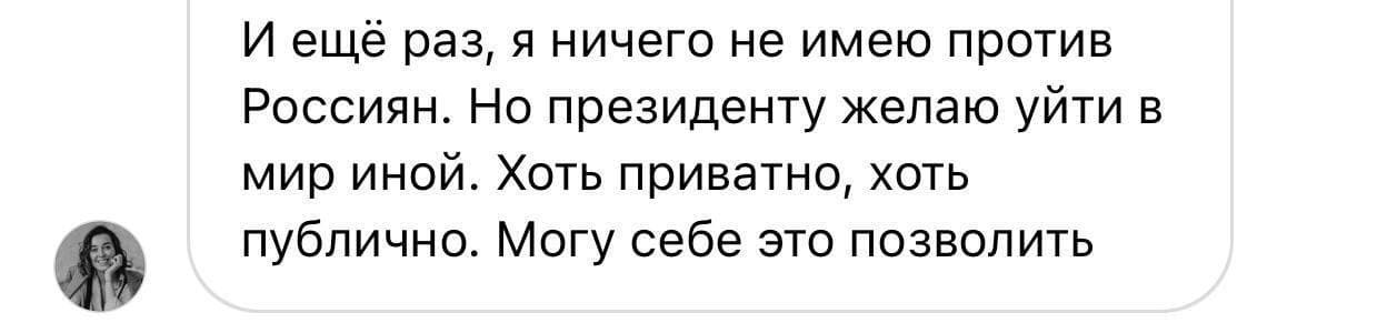 На другом скриншоте она поясняет, что имела в виду президента России Владимира Путина. При этом продюсер утверждает, что против граждан страны ничего не имеет. Она также добавила, что "может себе позволить" желать смерти российскому лидеру, вероятно, намекая на своё гражданство Украины.