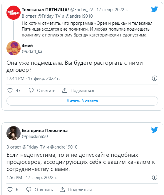 "Хотим отметить, что программа "Орел и решка" и телеканал "Пятница" находятся вне политики. И любая попытка подмешать политику к популярному бренду категорически недопустима", - добавили в пресс-службе телеканала.