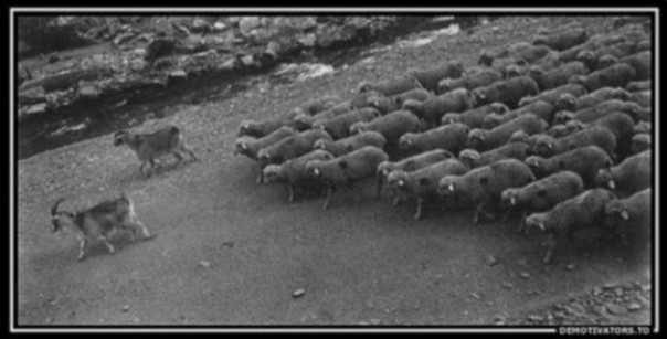 Посмотрите на фотографию, размещенную в блоге отца Андрея Ткачева. На ней козёл-провокатор — обученный, использующийся на скотобойнях. Его обязанность – возглавить и привести овец под нож. Овцы чувствуют неладное, но покорно идут за лидером. Своего ума и лидерских качеств у овец нет. Козёл ведет себя уверенно, чем успокаивает отару. Не правда ли, ситуация весьма напоминает украинскую?..