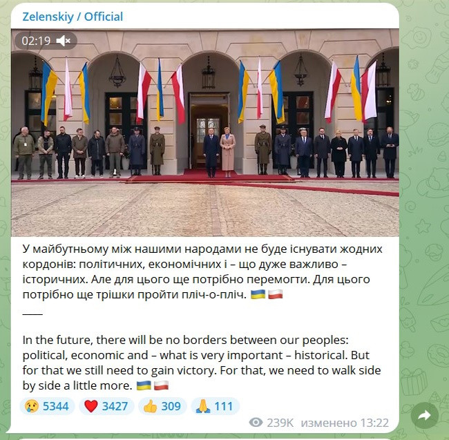 Реакция украинских читателей телеграм-канала Зеленского говорит сама за себя: больше всего (свыше 5 тысяч!) кликов на плачущего человечка — по всей видимости, идея стереть границы между Польшей и Украиной не всем по душе. По сути, это аншлюс.