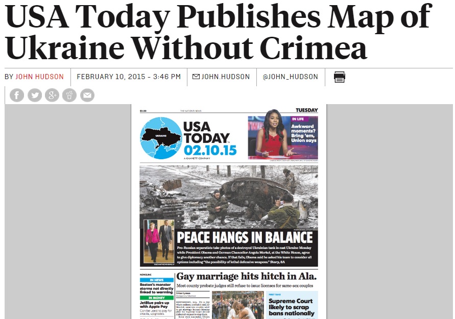 ]Американская газета "USA Today" опубликовала на первой странице выпуска от 10 февраля карту Украины без Крыма, пишет "Foreign Policy".
