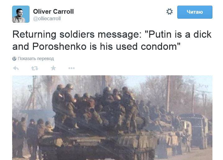 «Уже и западные журналисты открыто опровергают ложь Порошенки. Цитирую дословно: "Порошенко заявил о том, что во время вывода нет потерь. Это явно не соответствует действительности. Все солдаты, с которыми я говорил, сообщают о потерях, "сотнях" военнопленных".