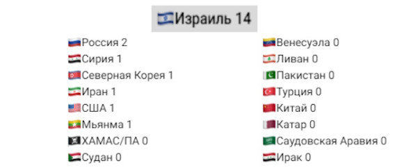 Сирия, Россия, Иран, Северная Корея, Мьянма вместе взятые даже близко не стоят с Израилем. Израиль абсолютный лидер! Других кандидатов на роль всемирного зла у ООН нет. Источник