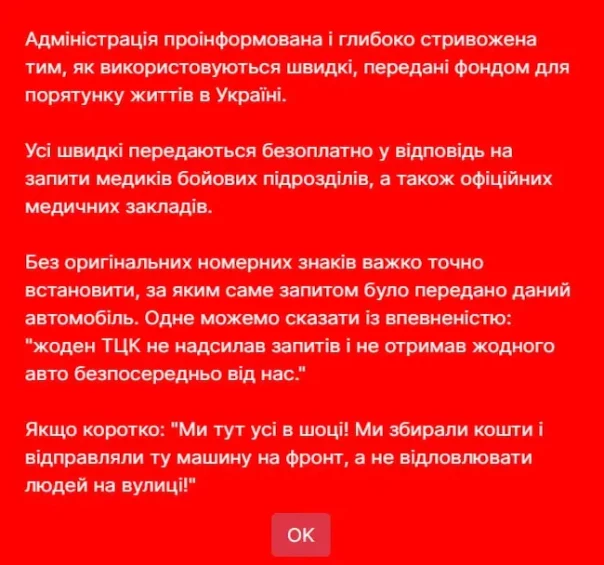 «Администрация проинформирована и глубоко встревожена тем, как используются «скорые», переданные фондом для спасения жизней в Украине. Все скорые передаются безвозмездно в ответ на запросы медиков боевых подразделений, а также официальных медицинских учреждений.