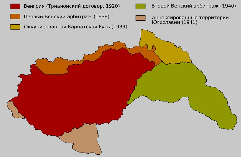 3 ноября 1938 и 30 сентября 1940 года в ходе озвученных в Вене решений Германии и Италии территория Венгрии заметно увеличилась, — а сопредельных с ней государств, соответственно, изрядно уменьшилась. Причем — без обычных в подобных случаях войн.
