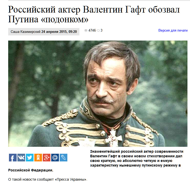 Типичный образец фейка из украинских СМИ. Там же на украинском сайте uapress.info опубликованы "стихи Валентина Гафта":