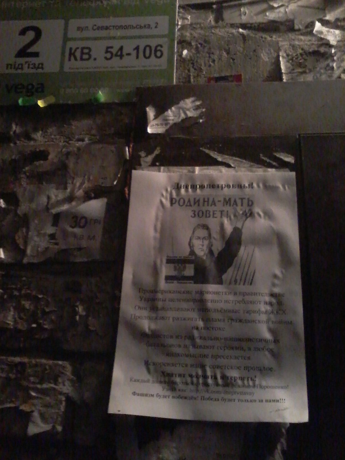 Как не старался режим, но на корню подавить сопротивление ему со стороны здоровых сил Днепропетровска на корню истребить не удалось. Невзирая на опасность репрессий и аресов в городе активно действует антибандеровское подполье. На днях город увесили листовки с призывом не покорятся антинародному киевскому режиму и присоединяться к борьбе против него.