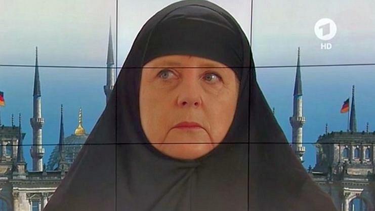 Немецкие СМИ тем временем тоже не удержались от соблазна постебать сомнительное гостеприимство канцлера. В частности, совсем недавно много шума наделал коллаж, показанный в новостной программе «Репортаж из Берлина» на канале ARD, в которой Меркель изобразили в хиджабе на фоне правительственного квартала и Берлина, заполоненного минаретами: