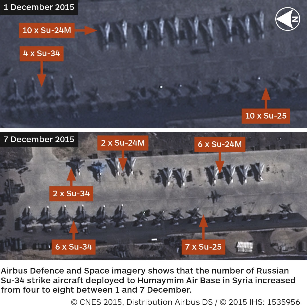 Как сообщает журнал "Jane's Defence Weekly" в статье Sean O'Connor "Russia deploys additional Su-34s to Syria", на спутниковых снимках, сделанных 7 декабря 2015 года, запечатлены четыре дополнительных фронтовых бомбардировщика Су-34 ВКС России на авиабахе Хмеймим близ Латакии (Сирия), что довело количество этих самолетов в составе российской авиационной группировки в Сирии до восьми.