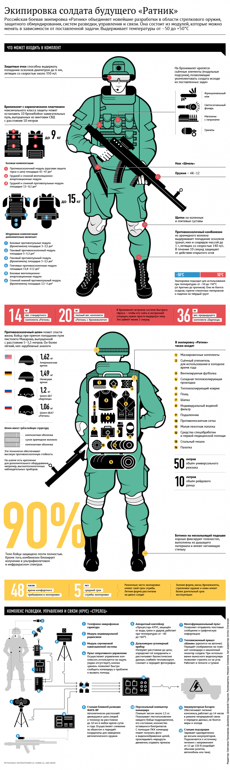Серийные поставки в российские вооруженные силы экипировки "солдата будущего" второго поколения "Ратник" начались в 2017 году. Ее комплект объединяет современное стрелковое вооружение, эффективные комплекты защиты, средства разведки и связи — около десяти различных подсистем. Он предназначен для действий в различных климатических условиях и в любое время суток.