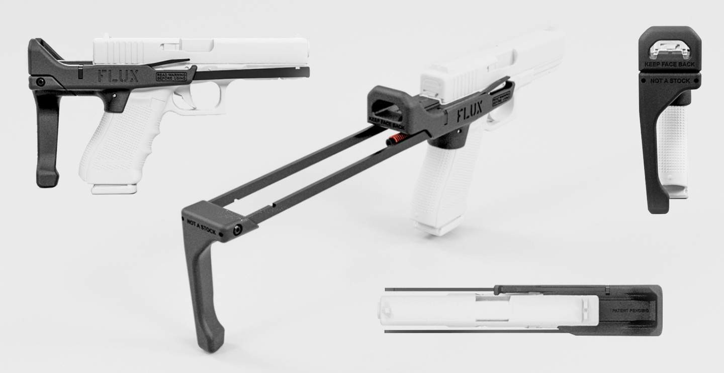 В результате в 2019 году в США анонсировали систему от компании «Флюкс Дефенс» (Flux Defense) с подпружиненным телескопическим «не-прикладом», устанавливаемым на пистолеты «Глок». Раскладывание этого «не-приклада» (честно-честно, на нём так и написано сзади — «not a stock») производится нажатием на специальный рычажок. А дальше уже стреляй, как хочешь.