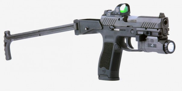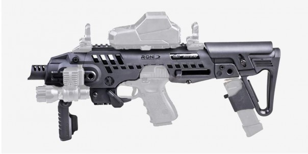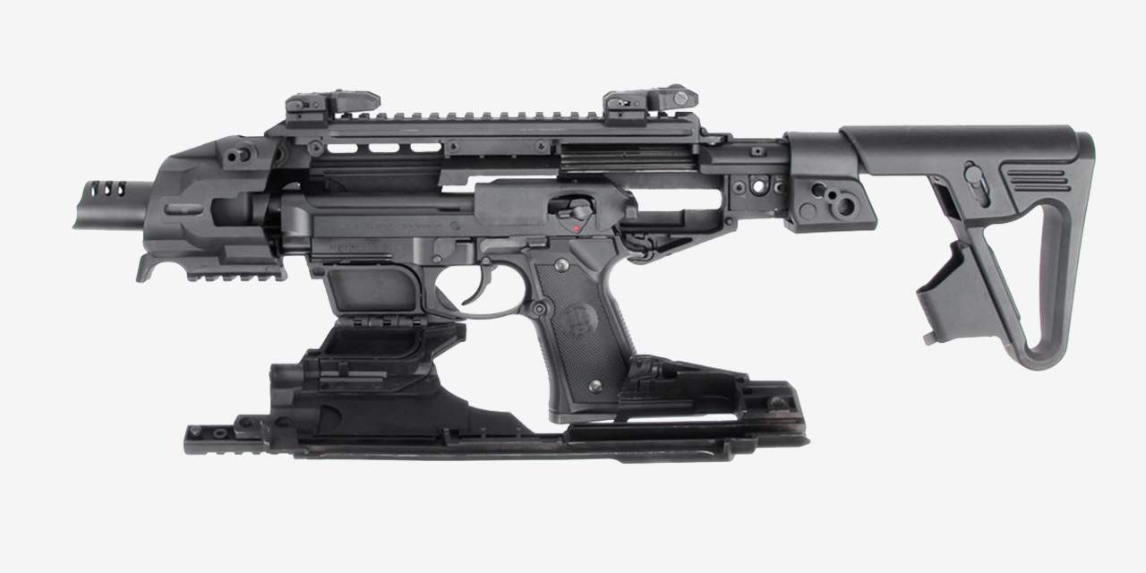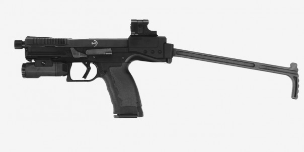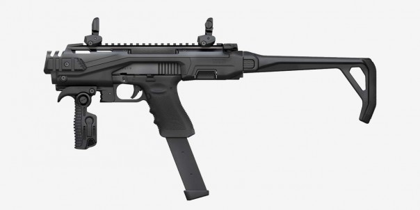 В результате получается нечто, напоминающее по виду слегка «сглаженный» пистолет-пулемёт «Узи», с довольно удобным регулируемым прикладом и кучей планок Пикатинни для крепления коллиматорных прицелов, лазеров, фонарей и прочих «тактических» аксессуаров на вкус владельца. При этом сам пистолет не только не подвергается каким-либо изменениям, но и не требует даже неполной разборки.