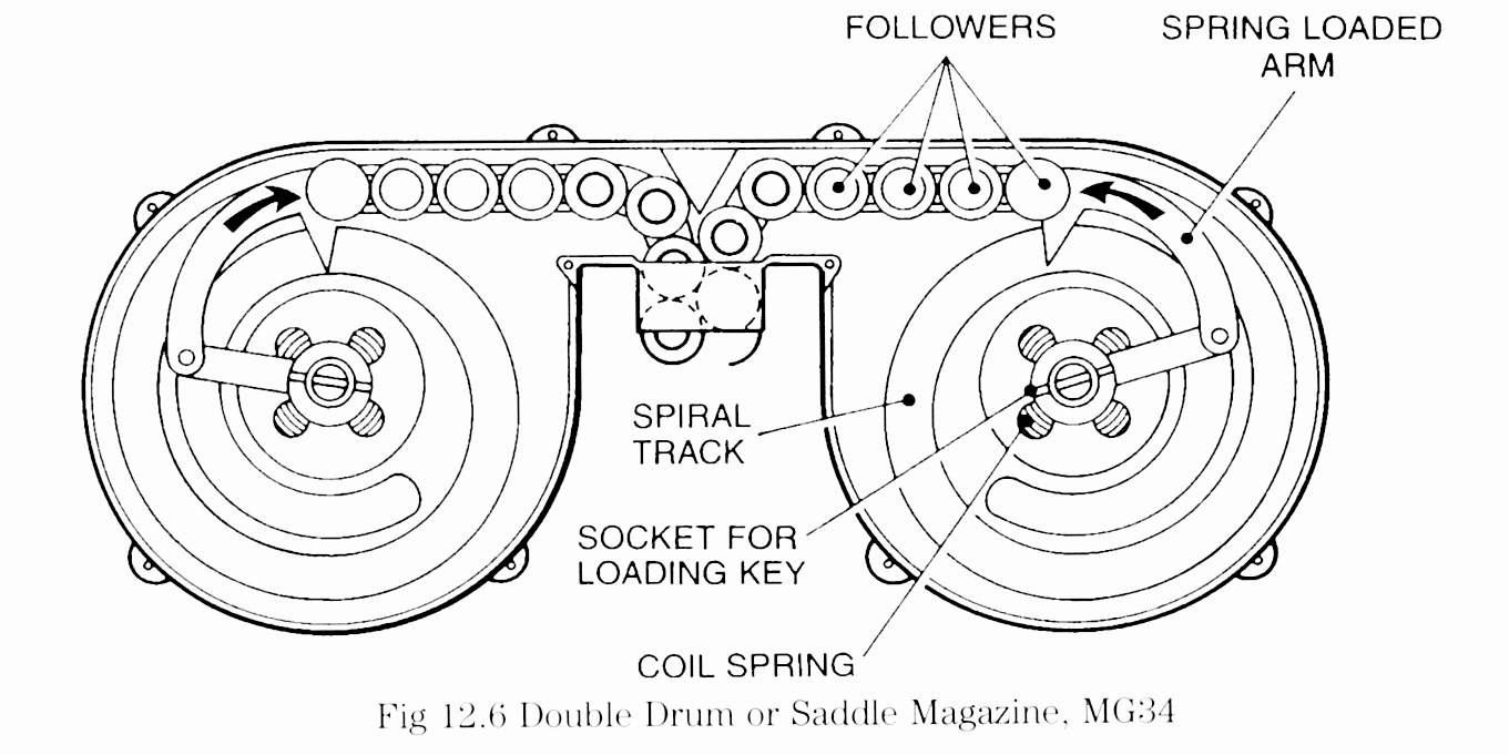 Существуют также спаренные барабанные магазины, в которых два барабана объединены общей выходной горловиной, при этом патроны в горловину попадают по очереди из каждого барабана.